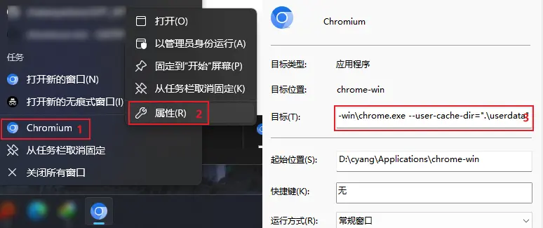 注意,如果固定在任务栏中,需要对任务栏中的快捷方式再次设置参数: