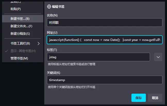 实际上,浏览器书签栏的书签能够保存 URL 外,还可以保存 JS 代码。最早我是在 Evernote 的剪藏小书签中遇到它的,它实际上就是运行了一段 JS 代码将当前的 windows.location 发送给 Evernote 服务器。