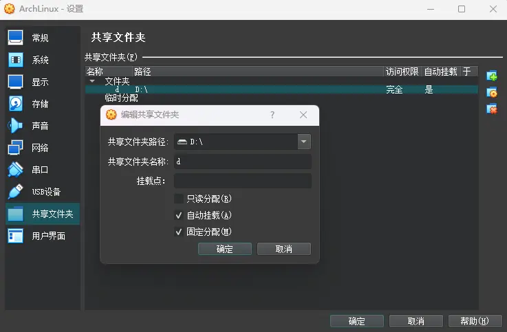 我把整个 D: 盘作为共享盘,记住这里的共享文件夹名称(随便起)。